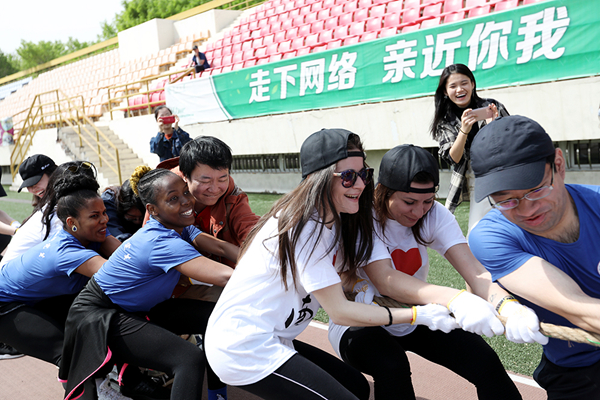 “一二,一二,一二……”在中外师生拔河友谊比赛中,师生们的呐喊声此起彼伏,大家都咬紧牙关不放松,最终中国师生们在技巧和力量上更胜一筹,取得了友谊赛的胜利。