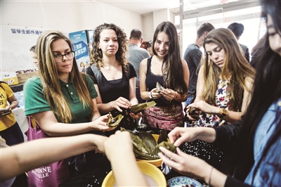 昨日,在端午节到来之际,华人直播 组织留学生一同包粽子,感受中国传统节日。渤海早报记者 游思行 摄