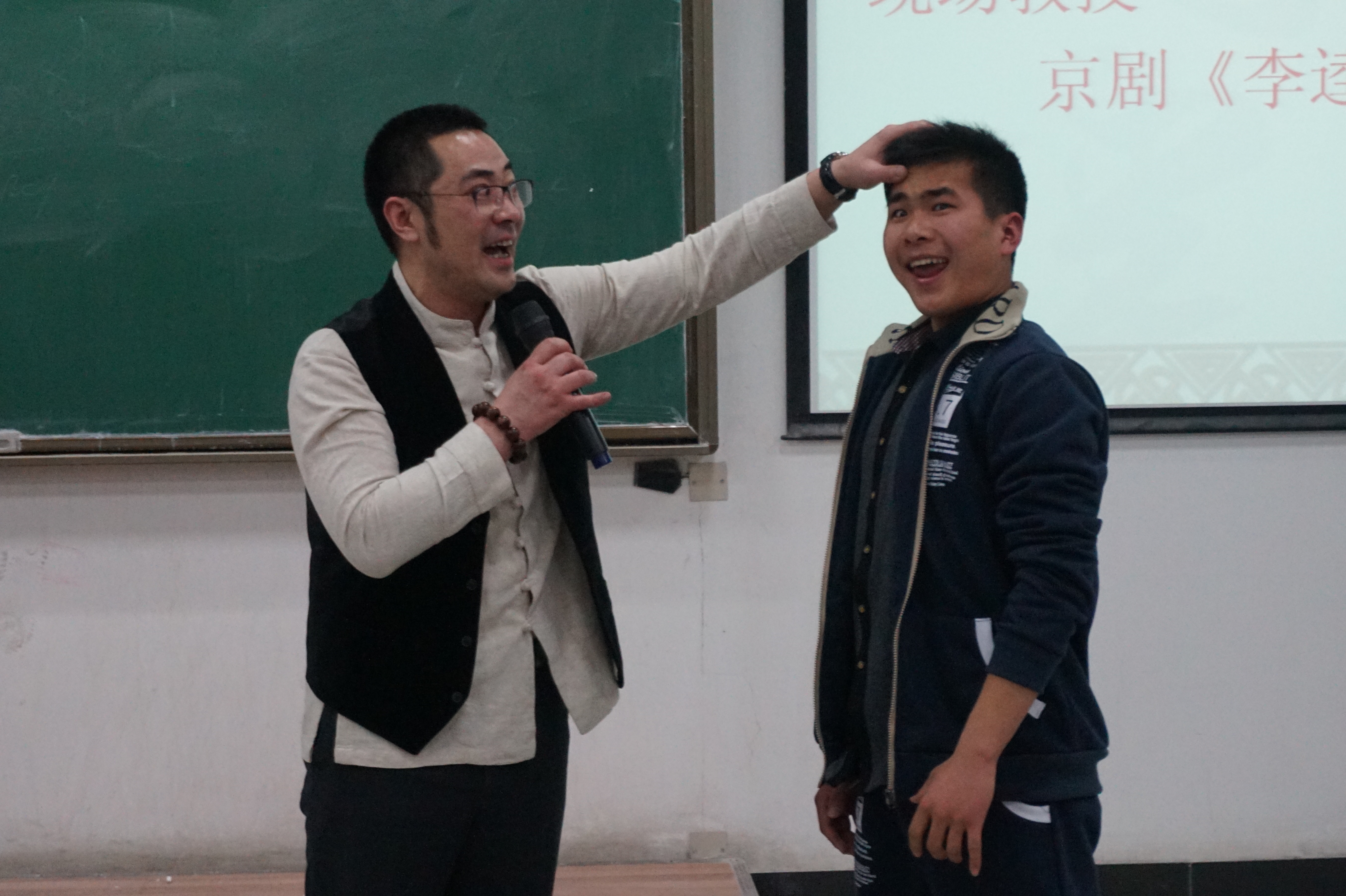 讲座开始,刘佳老师以一句“不到园林,怎知春色如许?”诗意地请出了王钦老师,由他引领同学们步入京剧的百花园,重点解读京剧净行的无穷魅力。王老师用深入浅出、风趣幽默的语言为同学们介绍了净行分类、表演技法和脸谱谱式等专业知识。谈到净行的声音形象时,他为大家示范了包拯、曹操、刘瑾等角色的唱念,充分展示出净行在演唱和念白方面,如洪钟大吕、珠走玉盘般的气势和爽利,让听者如醉如痴。讲座还精心设计了互动环节,同学们在王老师的指点下,现场学习了净行的表演方法。最后,王老师请出天津艺术职业学院的学生乐队,为大家演唱了京剧《九江口》选段,他声情并茂的演唱和深厚的艺术功力震惊全场。