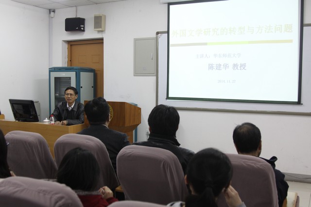本院讯:11月27日下午,华东师范大学文学院博士生导师陈建华教授来我院讲学。讲座由王立新院长主持, 来自汉院、文学院和外国语学院的60多名师生仔细聆听了本次讲座。 在讲座中,陈建华教授就外国文学研究的转型与方法问题、中国文学与俄罗斯文学的关系做了深入浅出的精彩论述,并与研究生们进行了互动,回答了学生们提出的问题。