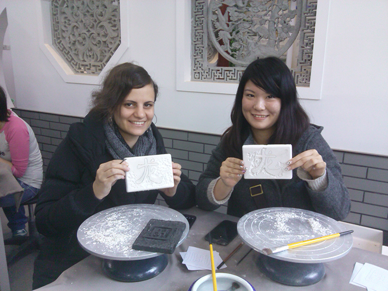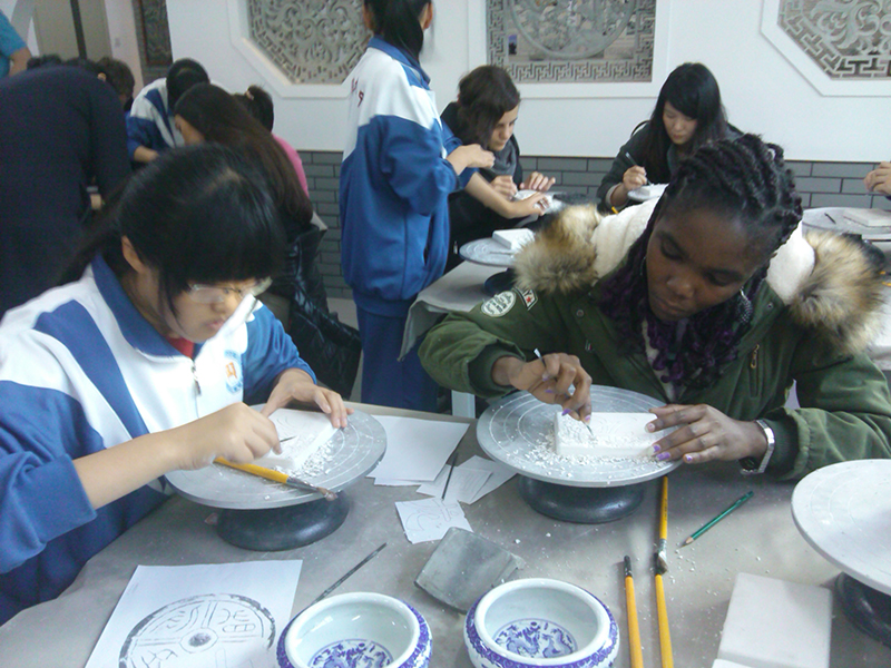 留学生们首先走进的是武术课堂。在这里,九中的老师们亲身示范中国拳术,引起了学生们的啧啧赞叹,一招一式地和老师学习起来。尽管寒风凛冽,留学生们的学习热情却十分高涨,不到十分钟就基本掌握了高中生需要三个星期才能学会的拳术。一从室外转到室内,学生们就为砖雕艺术之美所深深折服。尽管都是初次接触这一传统艺术,但是因为每位留学生都有一位砖雕社团的学生当“小老师”给他们讲解砖雕制作方法,所以没多久大家就纷纷热火朝天地开始了自己的砖雕处女作的创作工作。 经过一节课的辛勤工作,大家都培育出了自己的满意之作。