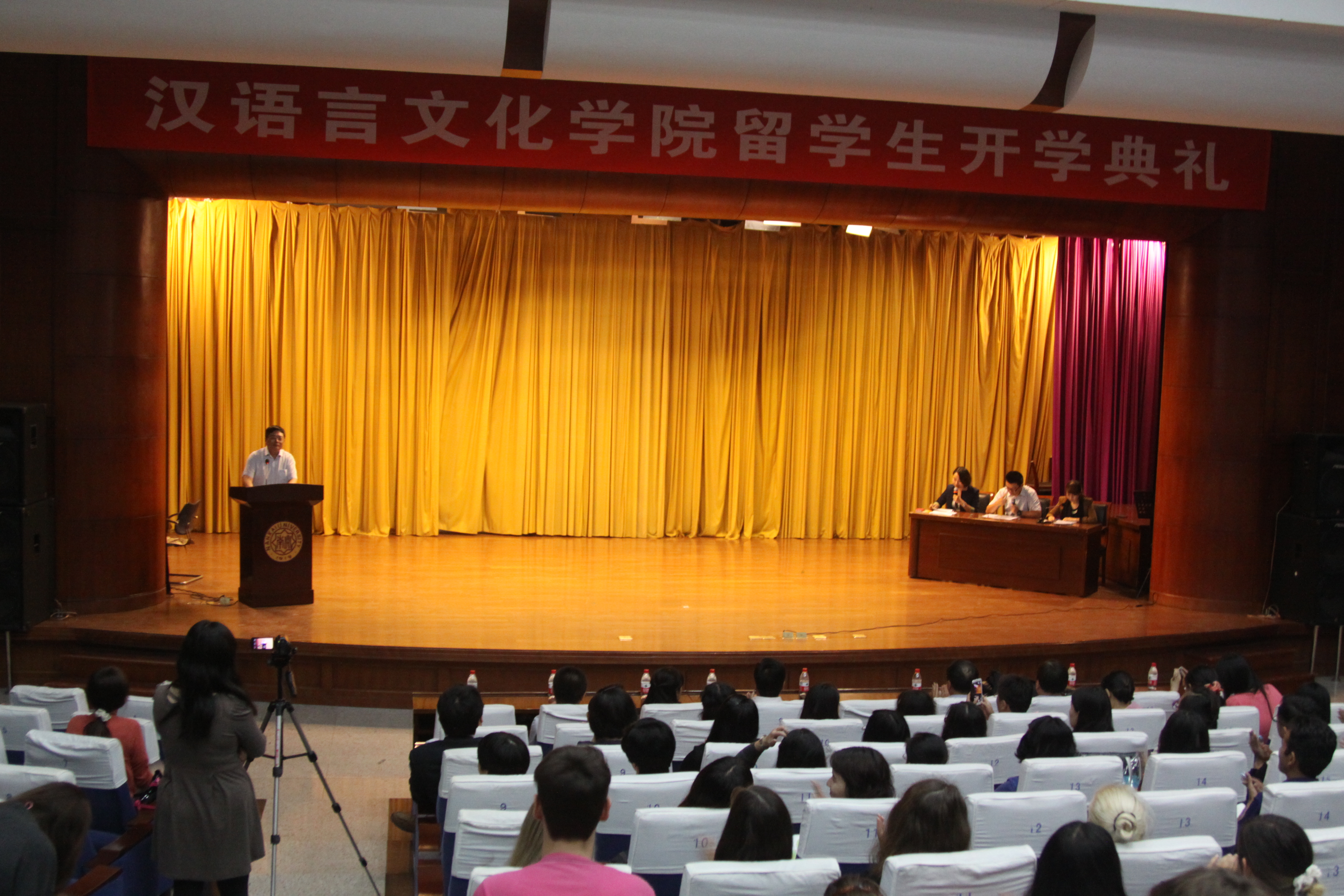 在激昂优美的校歌中,开学典礼拉开了帷幕。院长王立新对留学生的到来表示了欢迎。他介绍了华人直播 汉语教学的悠久历史以及华人直播 优秀的师资力量和高效、务实的教学方法,鼓励留学生们利用学院搭建的平台学好汉语,入乡随俗,成为真正的“中国通”。
