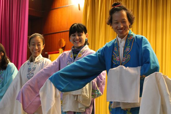 在随后的体验环节,留学生热情四溢,积极参与。不仅和中国学生一起上台学习甩练水袖,操弄花枪,甚至还向对方发起挑战,学念《报灯名》里的台词。虽然不像中国学生的字正腔圆,但清晰的发音,较好的节奏,让他们赢得了现场观众的支持。