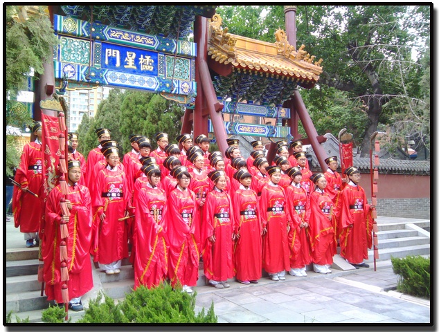上午10时,“祭孔大典”正式开始,汉院师生在天津文庙博物馆负责人员的指导下祭奠至圣先师孔子,在韶乐的背景之下,主、陪祭官向至圣先师孔子献三献礼。乐曲演奏《宣平之章》,舞生开始跳六佾舞。祭孔大典以歌颂孔子生前的业绩为主,将礼、乐、歌、舞巧妙融合。
