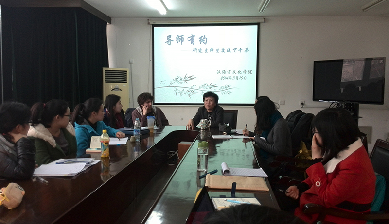 在老师的感染之下,各位学生都积极踊跃地发言,说出自己在研究过程中的各种困惑,虚心向祖教授寻求指导与帮助。2012级美籍硕士戴康锐,在研究方法上就学习策略测评和样本选择向祖老师请教。关于学习策略的测评,祖教授建议可以将问卷调查与考试考核相结合使用;关于样本选择,建议选取班级中成绩悬殊的学生作为比较,力求使用悬殊的样本探索学生汉字学习的最佳策略。2011级硕士研究生罗霞,由于刚结束海外教学工作,对于初级阶段的汉字教学很有心得,但是研究思路不够明晰。对此,祖教授一一分析目前汉语国际教育中海外文字教学的利弊,并在文献阅读以及理论基础方面提建议、做指导。