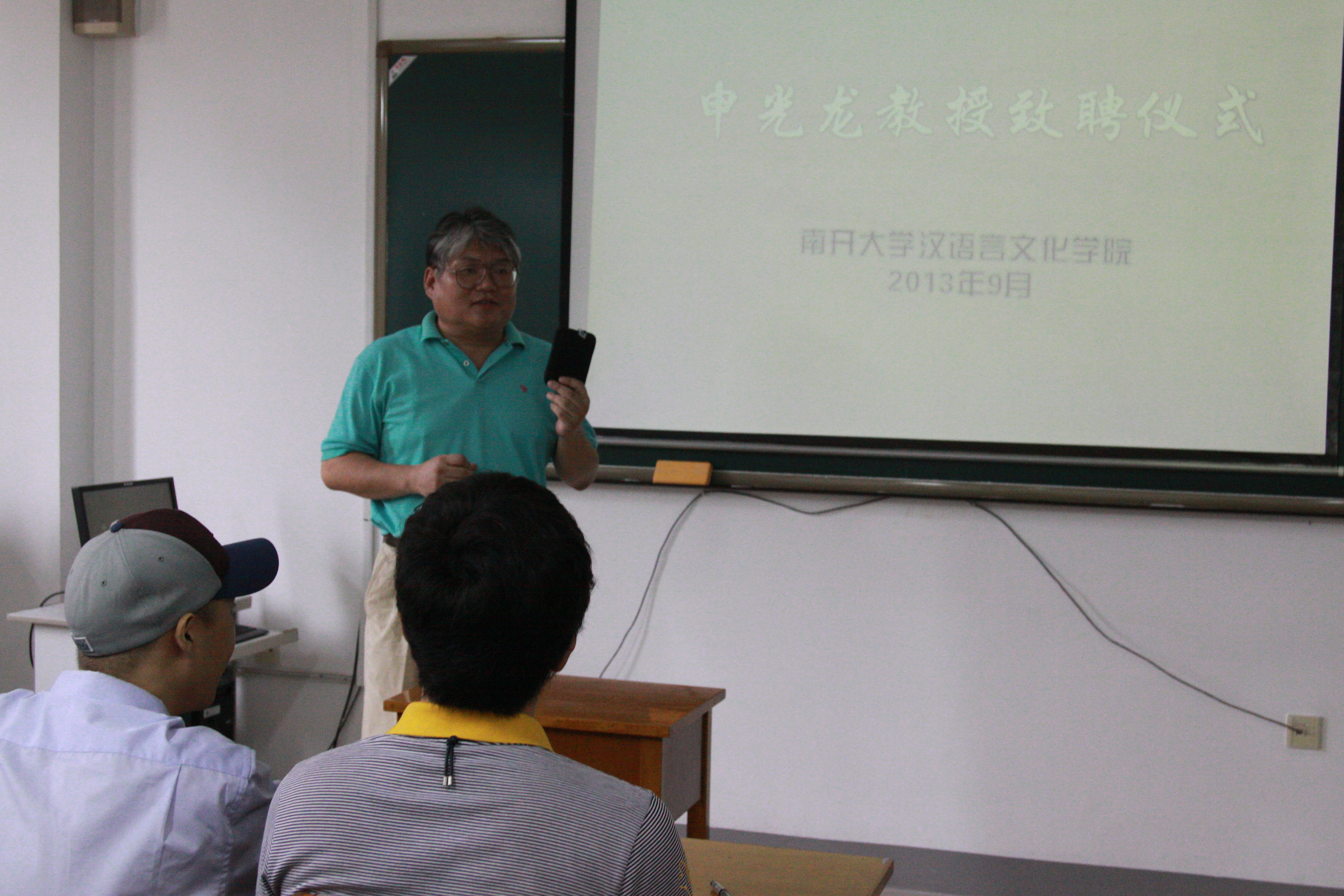 受聘仪式之始,王立新院长首先致辞,在双边经济迅速发展的今天,掌握在商务谈判中与中国人交流的知识是十分必要的,这也是学院为留学生开设本门课程的目的所在,院长鼓励更多的同学来学习这门课程。申光龙教授则介绍了本门课程的重要性以及自己对课程内容的一些理解,并将在授课过程中为同学们提供一些参考资料。申教授的解说无疑给留学生同学吃了一颗定心丸。