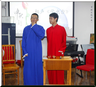 晚会在小品《中奖了》的精彩演绎中正式拉开了帷幕。随后,各组同学分别带来了自己精心准备的节目:不仅有传统与现代艺术相结合的美妙乐曲《水调歌头》, 还有充满了喜剧效果、包袱贴近生活、诙谐幽默的“穿越混搭小品剧”。而相声、歌曲等高质量精彩节目的一一呈现则获得了全场的一致好评,整台晚会的安排紧凑而丰富。在缤纷多彩的节目中间,团校导员们还别出心裁地穿插了两个小游戏,让各组同学在协作中完成游戏、增进感情,优胜的小组还获得了团校精心准备的小礼品,现场气氛十分热烈。最后,在全体大合唱的《相亲相爱》的歌声中,精彩的晚会圆满地落下了帷幕。