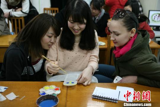 天津民间艺术家于全顺受邀为留学生们现场演示风筝制作过程,随后还下发了“毛坯”风筝,供留学生们亲手绘制。这些“老外”们显得异常兴奋又专注。