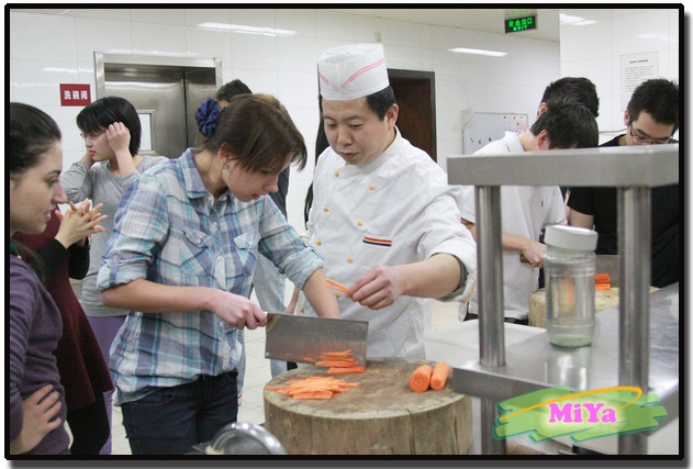 第一道工序是切菜。三位老师同时开始切胡萝卜丝:切片儿,叠片儿切丝。他们耐心地讲解动作要领,一遍遍地示范手腕、手指的动作。一位女生跃跃欲试,但拿起刀时却又露出一丝胆怯,老师和同学在一旁鼓励说:“别怕”、“加油”。于是,她模仿着老师,认真地切着,切出的胡萝卜丝既细又匀。老师则在一旁细心地提醒她注意手腕的动作并示范,大家都若有所悟地点点头。接下来,在老师的带领下,同学们又慢慢地尝试把辣椒和鸡肉切成丝。渐渐地,留学生们的刀法越来越熟练了。