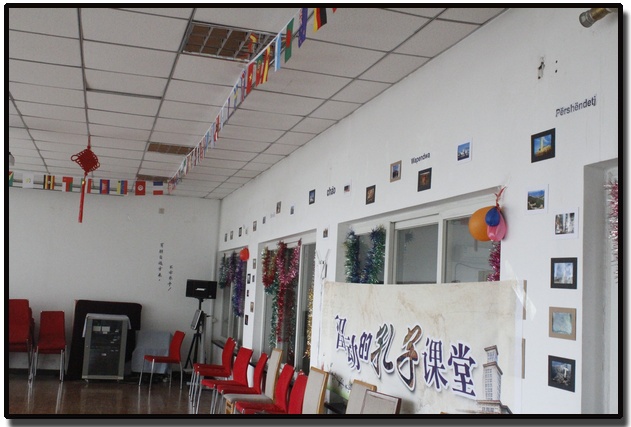 学生会的同学们将教室布置得充满多元文化交融的气氛。走进教室,墙上到处贴着代表世界各国标志性文化的照片,以大洲为板块,中国的旗袍、日本的茶艺、美国的好莱坞、澳大利亚的树袋熊……让人看得眼花缭乱。教室的屋顶还悬挂着各国的国旗,生动的向人们展示着世界文化交融与多元文化碰撞的新鲜魅力。同学们还细心地添加了中国元素,墙上贴着的“有朋自远方来,不亦乐乎”的字样,教室中悬挂的两个中国结,细小处透出了浓浓的中国味。