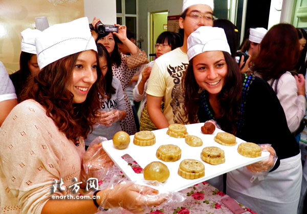 大多留学生在擀皮这个阶段就遇到了问题,长条的、方形的、太薄了、面少了,各种问题层出不穷,但是大家脸上都洋溢着笑容,甚至被自己或同伴的错误逗得开怀大笑。突然现场爆发出一阵掌声和喝彩声,“做的好,安杰娜,你的月饼真漂亮”,这位来自哥伦比亚的女孩开心地说到:“我喜欢中国的传统文化,我也喜欢烹饪,今天这个机会很难得,我又学会了做一样东四,我爱我的月饼,它美极了!”