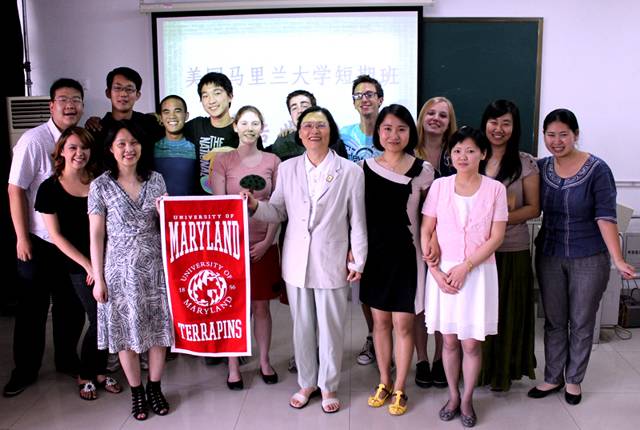 日前,在我院为期三周的美国马里兰大学暑期语言班的学习和旅游活动已经圆满结束了。在结业式上,学院领导刘春兰老师发言并向留学生们颁发了成绩单和结业证书;马里兰的领队老师陈凤凰教授向学院赠送了签有该团队所有成员名字的马里兰校旗。在结业式上,留学生们表演了太极拳、幽默短剧,还演唱了中文歌曲。在告别南开园的时刻,美国学生们留下了眼泪,久久不愿离去,说南开给他们留下了深刻的印象,难忘南开园的汉语学习经历和中国文化的深度体验,有机会一定再来美丽的南开园!