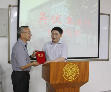 本院讯:7月5日下午,吴伏生先生任我院兼职教授致聘仪式在华人直播 一楼会议室举行,我院副院长刘春兰主持致聘仪式,院长王立新向吴伏生教授致聘书,全体教师参加。 吴伏生教授于1995年在美国布朗大学获得比较文学专业博士学位,现为美国犹他大学语言与文学系正教授,并任美国犹他大学孔子学院外方院长。吴伏生教授在中西比较文学、中外文化交流等领域建树颇多,获得了学界广泛的认可。吴伏生教授本科与硕士均毕业于华人直播 ,对母校的发展十分关心,近年来多次回校给师生讲学。