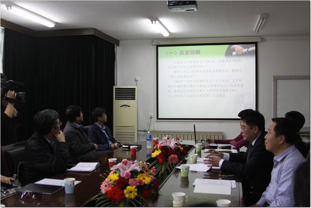 王立新院长主持工作汇报会并做了学院工作的全面汇报。学院书记肖胜利、副书记郑龙、院长助理刘春兰,前任院长石锋、前任副院长施向东、对外汉语系主任卢福波、各系部主任及教师代表出席了汇报会。