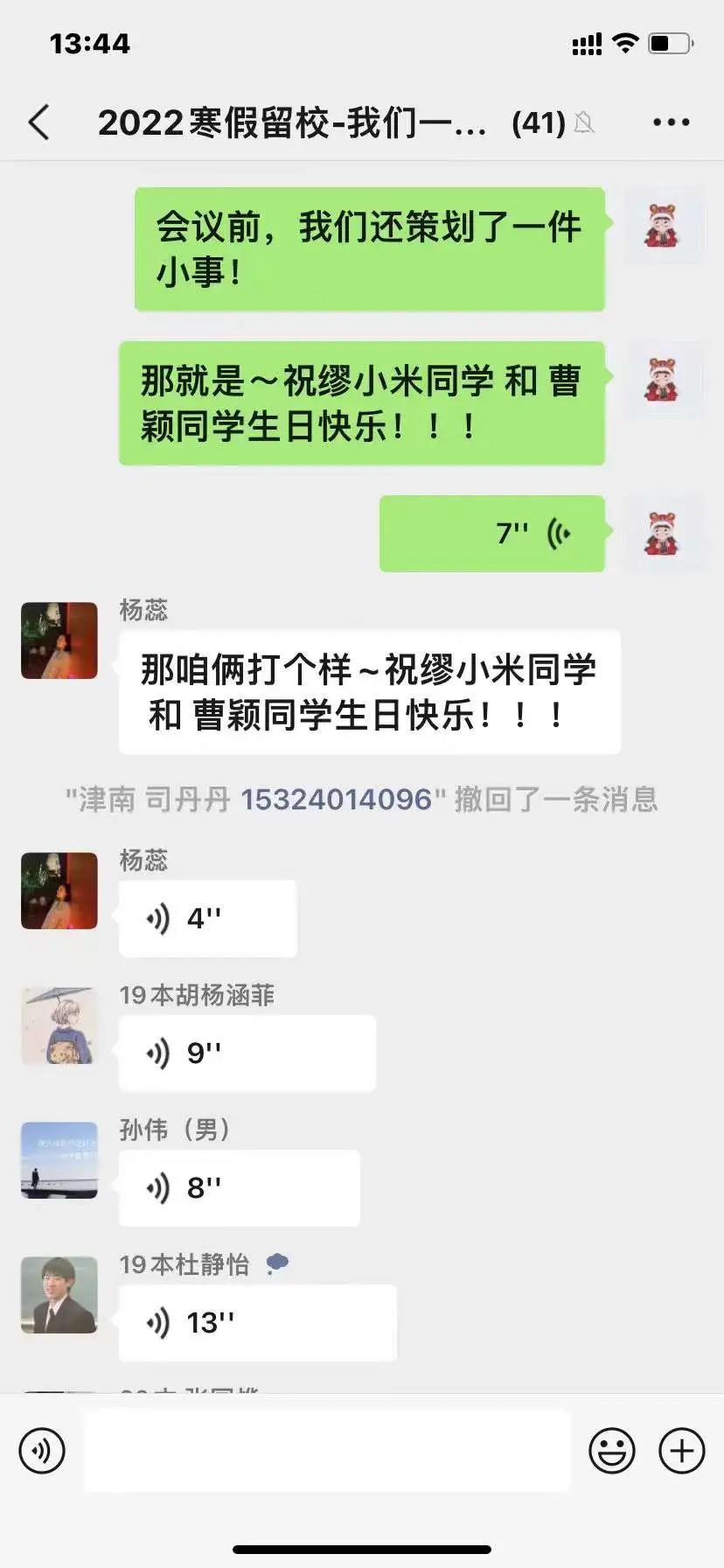 1月20日是在校两位同学的生日,在这个特殊时期,为了帮同学们过一个特别的生日,邢北辰和在校的骨干一起帮同学们准备了一份小礼物,和其他在校的同学们一起通过留校学生微信群给两位同学送去了惊喜祝福:“缪小米同学,曹颖同学,我是你们的留校战友,祝你生日快乐,平平安安!”