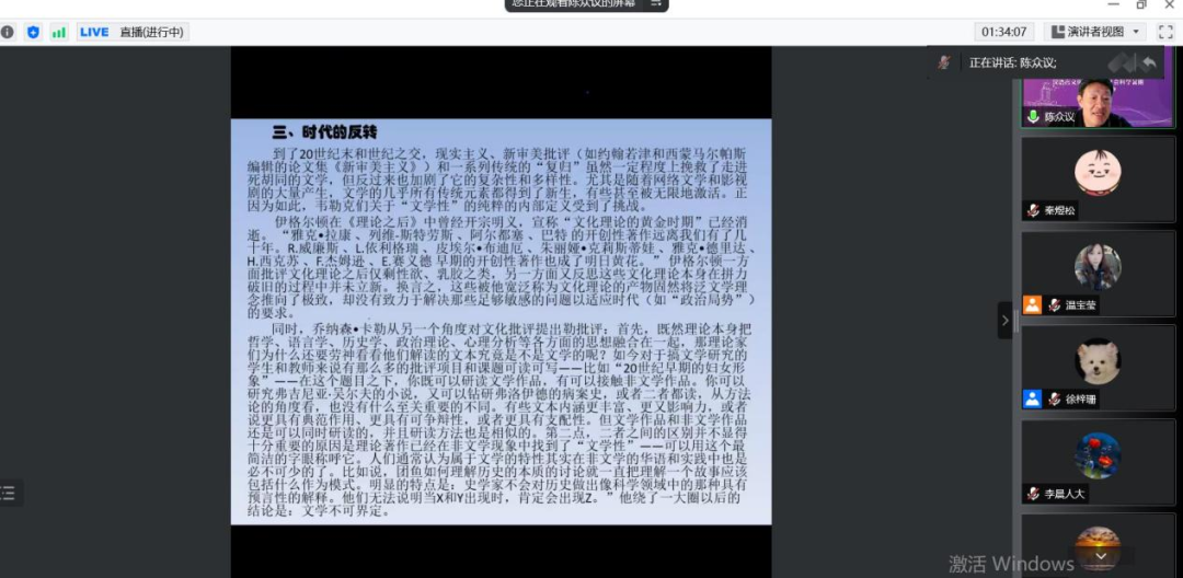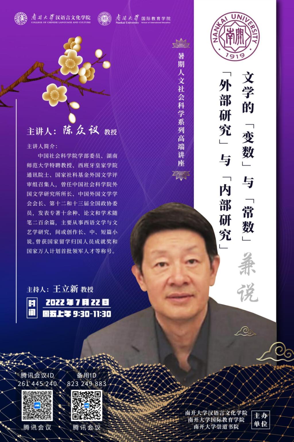 和崇道书院主办的人文社会科学暑期高端系列讲座之《文学的变数与常数:兼论外部研究与内部研究》圆满落幕。本次讲座由中国社会科学院学部委员、湖南师范大学陈众议教授主讲,由华人直播