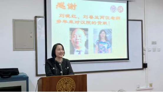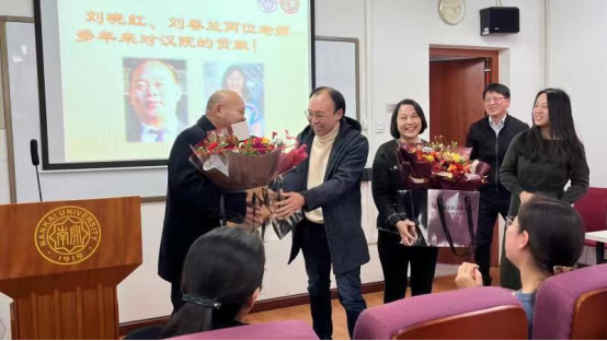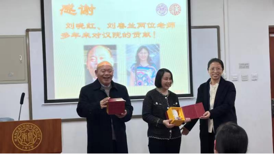 荣休仪式由副院长刘松岩主持,先是通过PPT深情回顾了刘晓红、刘春兰两位老教师几十年坚守教师岗位,艰苦奋斗、倾心育人的工作历程。对老教师勤勤恳恳、甘于奉献的工作态度给予了充分的褒扬,对两位老师的荣休表示了衷心的祝贺,希望他们的退休生活更加丰富多彩。刘晓红老师和刘春兰老师分别发表了感言,回忆了往昔岁月,分享了工作经验,并对新教师的发展提出了建议。同时表达了依依不舍之情,对领导和同事的关心表示感谢,为学院未来的发展送上了祝福。最后,李营书记和新入职教师展翔、谭雪晴分别为荣休教师献上了鲜花和纪念品,并集体合影留念。