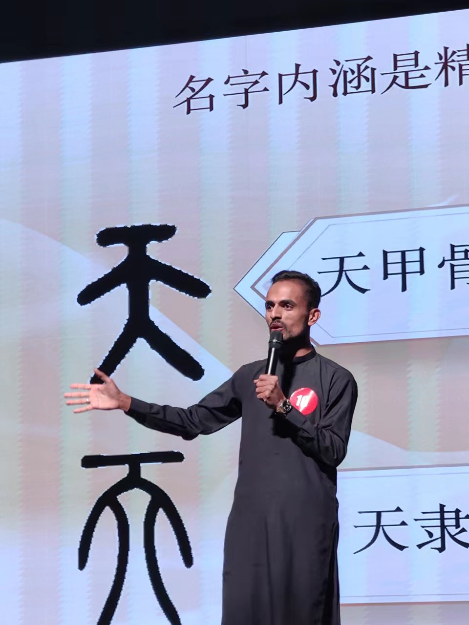 硕士生张天毅同学的题目是《我与汉字的故事》,他的汉字情缘起源于儿时的学习经历,在安阳市内黄县考察参观二帝陵的过程中他发现,姓氏“张”正是颛顼的后代。他在汉字中探寻“美美与共,天下大同”的中国智慧,在传统文化中感悟自信自立,谦逊包容的中国风度。他汉语发音标准,语言流畅,演讲激情澎湃,极富感染力。