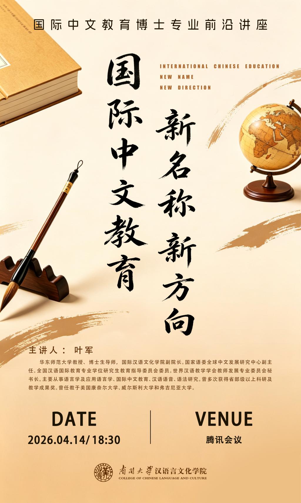 “国际中文教育博士专业前沿讲座”,特邀华东师范大学叶军教授主讲“新时代国际中文教育:新名称·新方向”。讲座由华人直播